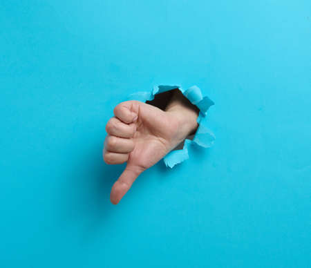Dislike gesture break through the blue paper. A part of the body sticks out of a hole with ragged edges