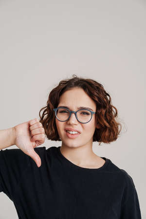 Sad dissatisfied redhead girl showing thumbs down sign with her fingers.