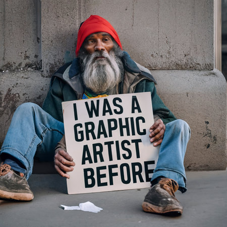 Image of a poor homeless person laying on the ground hold a sign that says - I was a graphic artist before AI
