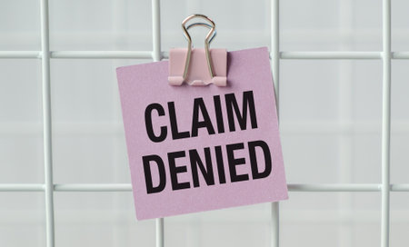 A pink sign that says Claim Denied is hanging on a white metal fence. The sign is clipped to the fence with a binder clip