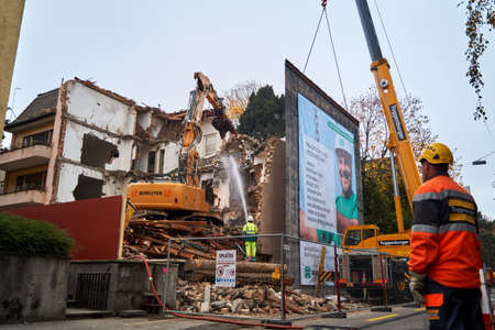 Urban Regeneration. Demolition of a building for new construction. Dismantling of a house. Excavator demolishing barracks for new construction project. Urban Renewal‎.