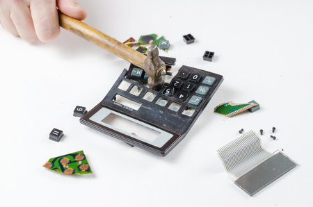 Nervous, irritated man smashes calculator with hammer. His hand hits the plastic casing of the electronic device with a small metal hammer.