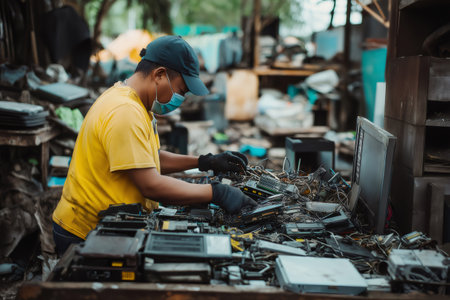 Technician wearing gloves and mask sorting electronic waste for recycling in developing countries