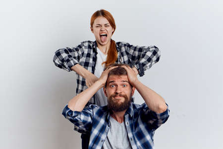 young beautiful woman with a bearded man on a light background, quarrel, scream.