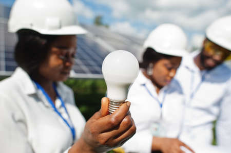 African american technician checks the maintenance of the solar panels. Group of three black engineers meeting at solar station. Hold led bulb.