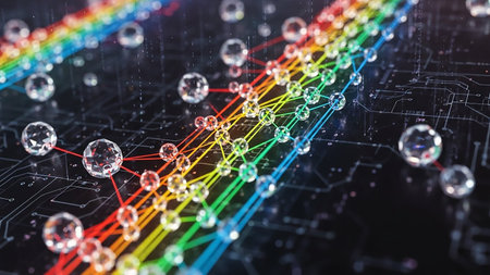 A vibrant abstract featuring a network of rainbow-colored lines connecting crystal spheres against a dark digital circuit board.