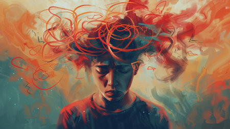 A person's thoughts and emotions are like a jumbled mess, representing the chaos of anxiety. Generative AI