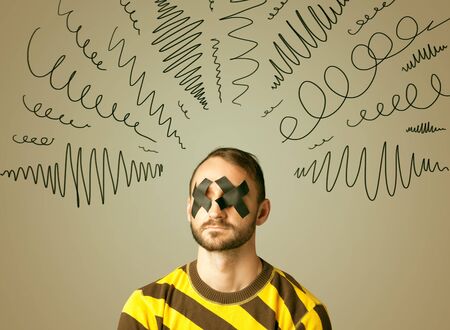 Young man with taped eye and curly lines around his head