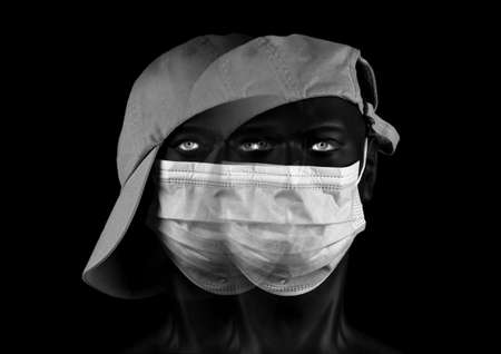 Double image of dark plastic mannequin head with clear eyes, face mask, and cap with visor, black background, monochrome photo