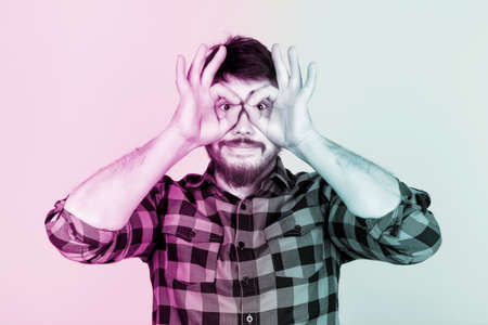 man with hands in the form of glasses of virtual reality, toned colorful image