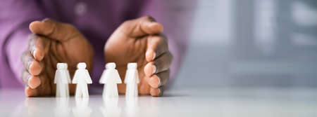 Close-up Of A Human Hand Protecting Red Human Figures On White Background