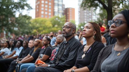 Attendees sit quietly in an urban park, dressed in black to commemorate lives lost to violence. The gathering reflects a sense of unity and sorrow as they listen to speakers and support one another during the vigil.