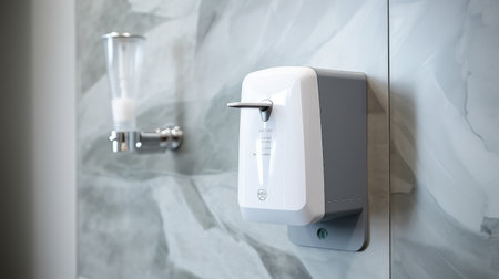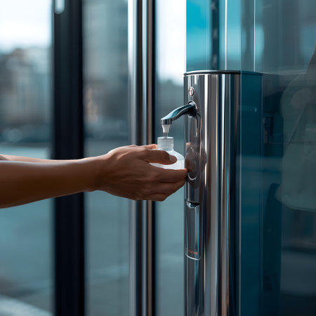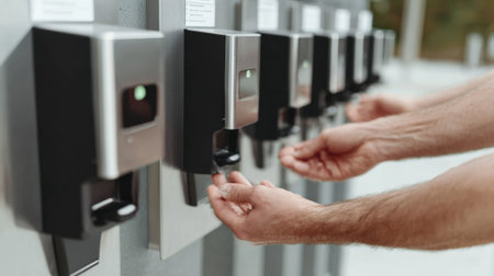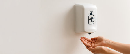 Hands are positioned under a wall-mounted hand sanitizer dispenser in a modern space, promoting hygiene and cleanliness during daily activities.
