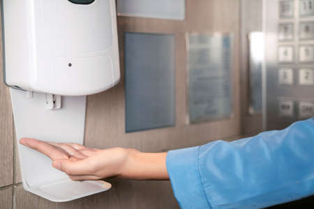 New normal for auto alcohal feeder machine in elevator for prevent corona virus covid19, this image can use for covid-19, covid, health and new normal concept