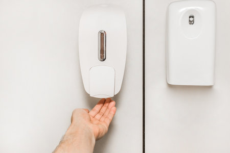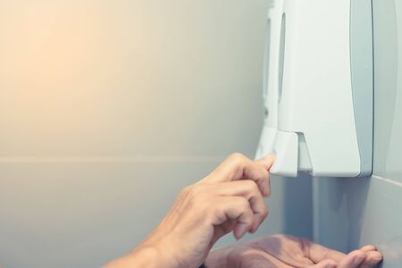 A hand pushing the button of the liquid soap bottle. Hand sanitizer against germs and viruses. The photo was taken while liquid soap was flowing.