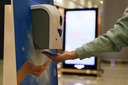 man hands using wash hand sanitizer gel dispenser, against Novel coronavirus or Corona Virus Disease (Covid-19) at public train station. Antiseptic, Hygiene and Healthcare concept