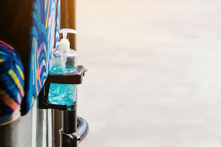Blue alcohol gel bottle hanging on the door of the double-decker bus to serve passengers and prevent the spread of Virus . Travel safely on public transport. New normal lifestyle.