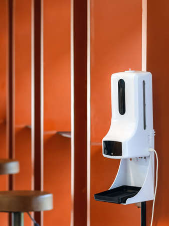 Stand automatic alcohol dispenser spraying with automatic body thermometer check temperature for covid-19 pandemic for safety before entering the coffee shop. Equipment to control and kill virus.