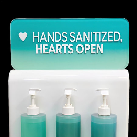 Hand sanitizer station promoting hygiene and open hearts on transparent background