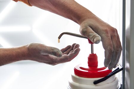 Mechanic applying washing soap to clean dirty hands after work