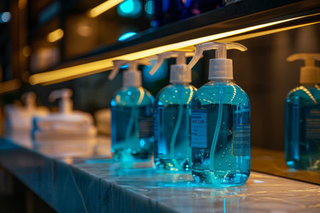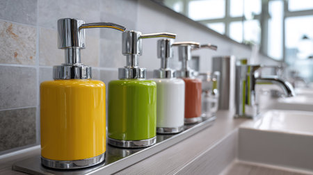 A visually appealing arrangement of colorful soap dispensers displayed on a modern bathroom countertop, emphasizing cleanliness and stylish decor.