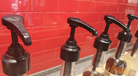 Row of pump head bottle of beverage or syrup in cafe.