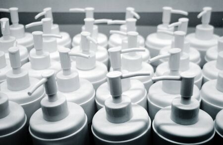 Bottle of liquid soap, shower gel or shampoo. Toned image. Shampoo bottle with dispenser. close up view