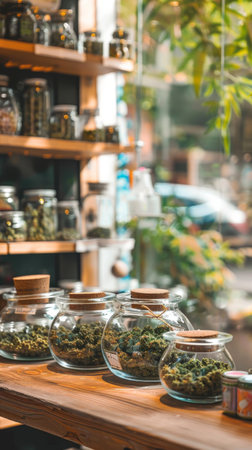 Glass jars with cannabis leaf labels neatly arranged on wooden shelves in a cozy shop
