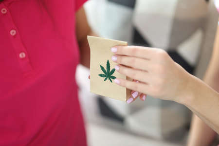 Woman hand passes paper bag with and marijuana closeup