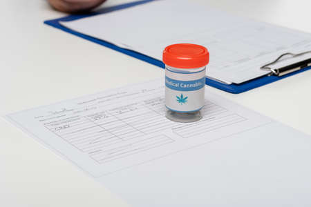 container with dry medical hemp near medical cards on white desk