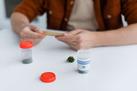 cropped view of blurred man making joint with medical cannabis