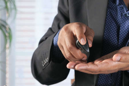 businessman using sanitizer gel on on office desk