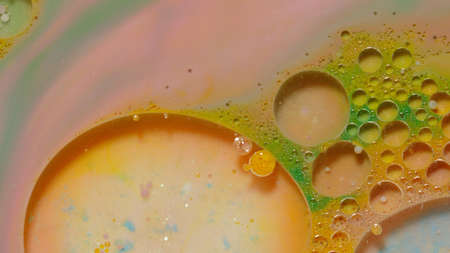 Fantastic structure of colorful bubbles. Chaotic motion. Abstract colorful paint. Top view. Movement of bubbles in the liquid. Oil surface multicolored background. Macro