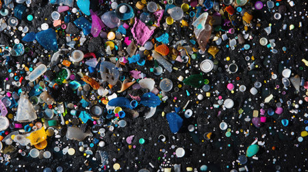 Close-up of microplastic particles background. Environmental water pollution problem of rubbish and trash in the oceans and seas