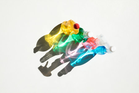 Containers swimming. Dirty muddy water being filled with plastic bottles and razors while causing polluting