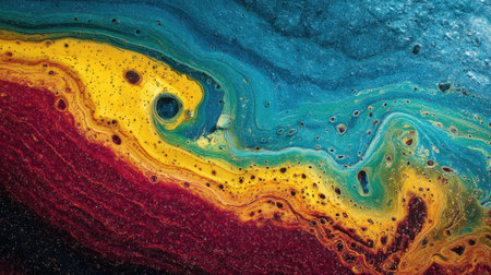 Colorful oil slick on asphalt, creating a vivid display of swirling rainbow hues and bubbles. Abstract art concept highlighting natures beauty.