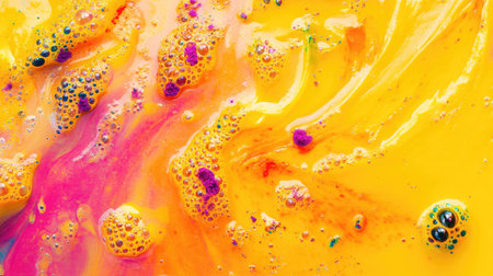 This vibrant abstract image features swirling yellow and pink hues with bubbles, creating a lively and dynamic appearance suitable for various creative projects.