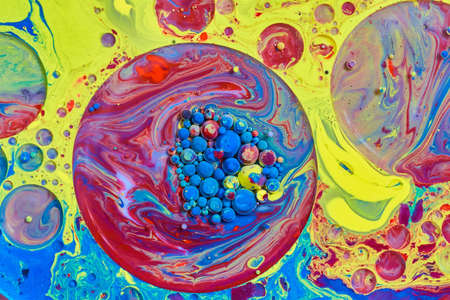 Bright ink bubbles mixed with liquid substance of oil, milk, soap. Floating acrylic paint on colorful surface. Abstract multicolor macro hypnotic transformation themes or wallpaper painting background