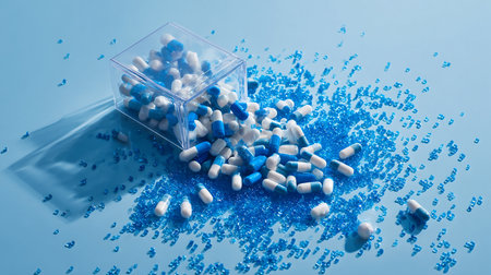 Blue and white pills in a plastic box on blue background, 3d illustration