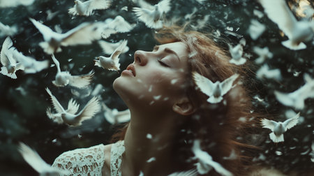 A woman with flowing hair embraces a flurry of white doves in a serene forest setting during the late afternoon light