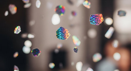 A captivating image of vibrant glass shards floating gracefully against a colorful background, enhanced by sparkling water droplets and soft focus elements.