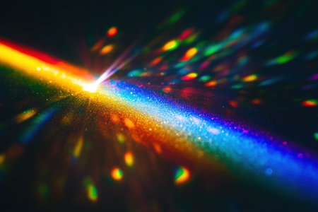 A dynamic and colorful image featuring a rainbow light beam with sparkling effects, creating a sense of energy and movement against a dark background.