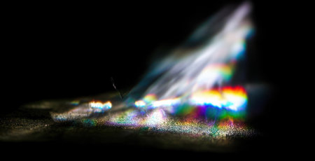 A beam of rainbow light illuminates a dark space, creating colorful reflections on a surface