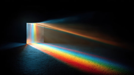 vibrant colors radiate from glass prism as it refracts beam of white light into rainbow spectrum against deep black background, showcasing dispersion and wave optics