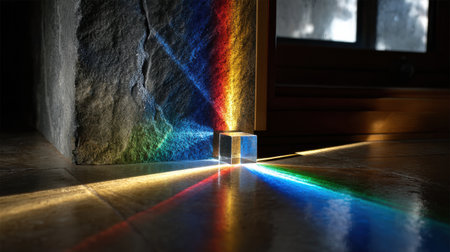 A cube is lit up with rainbow colors, creating a beautiful and colorful effect. Concept of wonder and awe at the natural beauty of light and color