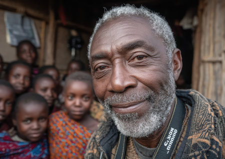 Smiling elderly man with gray hair stands in front of children dressed in colorful clothing, capturing a joyful moment in a lively village atmosphere filled with cultural richness