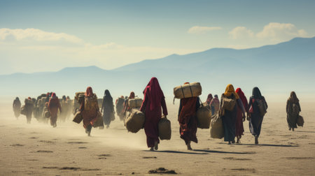 A family of refugees walks along a dusty road at sunset, carrying their belongings. The poignant image symbolizes migration, displacement, and the hope for a new beginning. The setting sun casts long