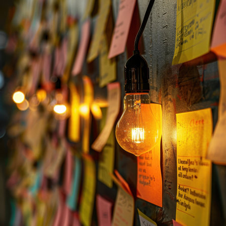 A vibrant inspiration board filled with colorful sticky notes highlights creativity in a workspace. A vintage light bulb casts a warm glow on this dynamic setup, perfect for motivation.