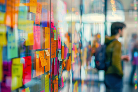 Brainstorming Session, Colorful Notes on Glass Wall, Innovation and Marketing Concept