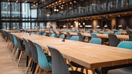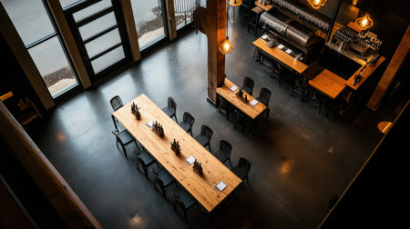 Modern restaurant with long wooden tables, chairs, and flooring. Ambient atmosphere, rustic interior design.